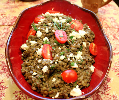 Lentils benefit from added flavor. This salad is brightened with sprigs of thyme, bay leaves, whole cloves, garlic and red wine vinegar. Sprinkled with goat cheese and cherry tomatoes it is a winner. Served at room temperature, it goes well with grilled meats or as a stand alone dish for lunch. Thanks for the recipe Steve. It was delicious!