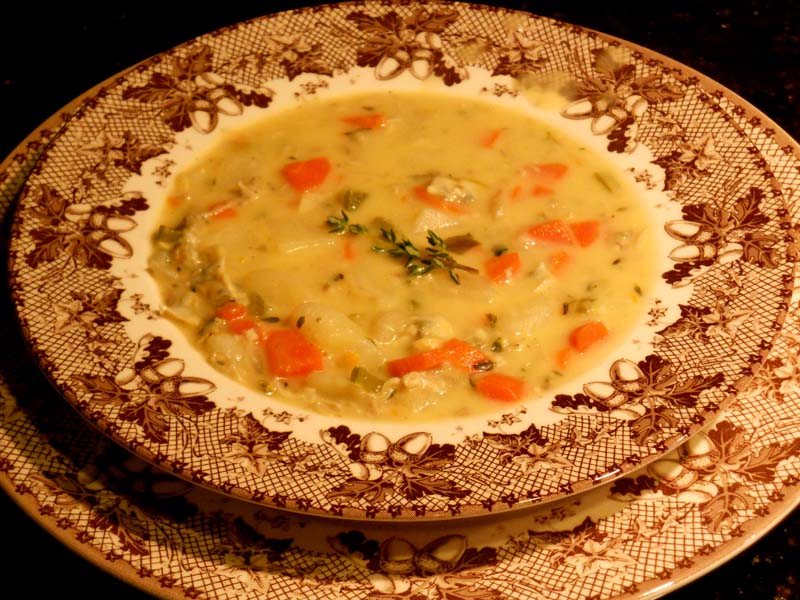 The basis of this soup is a box of Imagine* Brand Organic Creamy Potato Leek Soup. I don’t usually like canned or boxed soups, but this one is really good. Other convenience items that make it so easy are frozen carrot slices, frozen corn and canned chicken broth.