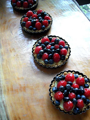 The second Barefoot Blogger recipe for the month of August is this beautiful mixed berry cheesecake. The recipe was chosen by Nathalie of Snowbell Jewelry and it is so impressive, even if I didn’t make it in it’s original form. Our extended family is not arriving for the Labor Day Holiday until the end of the week so I was making this for just the two of us. The two of us do not need a dessert that contains 2 1/2 pounds of cream cheese. So instead of making the cheesecake in a springform pan, I reduced the recipe and made five individual cheesecakes.