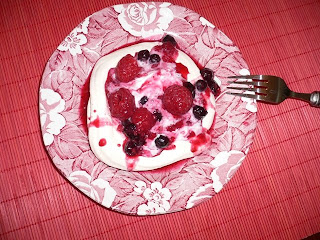 I made an adaptation of Karen Barker’s Double Chocolate Waffles with Strawberries and White Chocolate Ice Cream. For one thing I do not have a waffle iron here in Florida, nor do I have an ice cream maker. It is characteristic of many of the Barker’s recipes that many separate preparations are required for one final presentation. To simplify, I made a batch of chocolate pancakes instead of waffles and did them ahead of time as you would crepes, and right before serving time all I had to do was crisp them on a cookie sheet in the oven. They are supposed to be crisper than a pancake just off the griddle anyway. Also the recipe makes at least 24 4″ pancakes which is enough for 12 servings so the extras can be frozen or the recipe can be halved. Instead of ice cream, I whipped heavy cream with a little sugar and vanilla and piped onto the plate. I have included the recipe for the Bittersweet Chocolate Sauce, but you could also use a purchased chocolate sauce. The Strawberries were fresh from Plant City, Florida and required only a little sugar to bring out the juices.