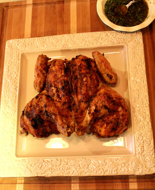 Grilling season has begun on our deck. What better way to mark the event than with this special spatchcocked chicken cooked under a brick. The weight of the brick serves two purposes; to hold the chicken in its flattened state and to keep all of the surfaces in contact with the grill to ensure crispy skin.