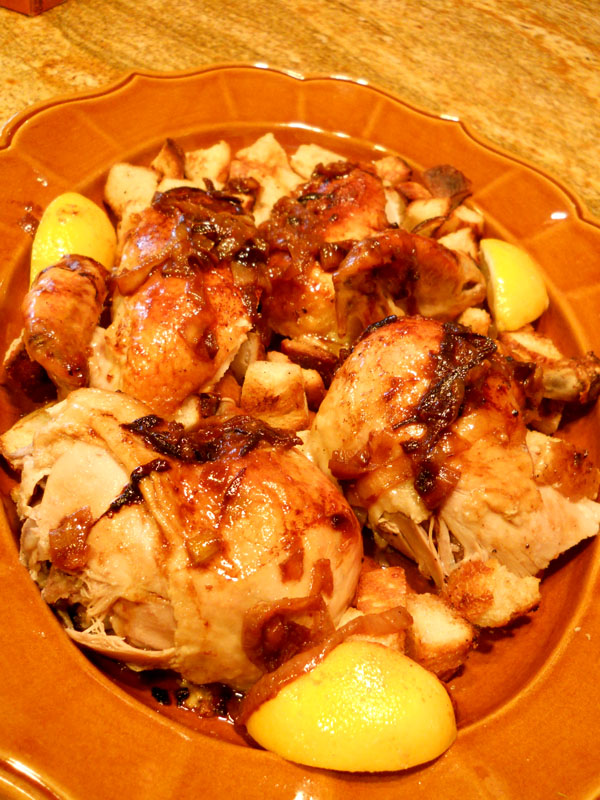 Holding a knife at a 45 degree angle slice the chicken crosswise and arrange the slices, overlapping them slightly, on a platter. Spoon some of the sauce around the chicken and serve the remaining sauce separately. Serves 4.