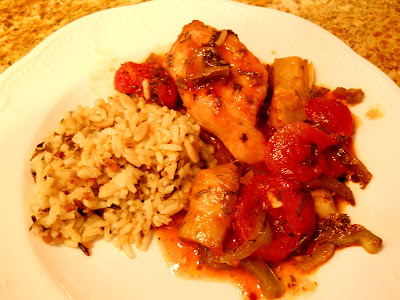 Preheat oven to 350 degrees F. Heat oil in a large frying pan over medium heat. Dridege chicken in flour then place in pan and brown for 10 minutes. Add Garlic and bell pepper and cook until soft, about 5 to 6 minutes. Add artichoke hearts, stewed tomatoes and mushrooms; remove from heat and place in a 9 x 13 inch baking dish.