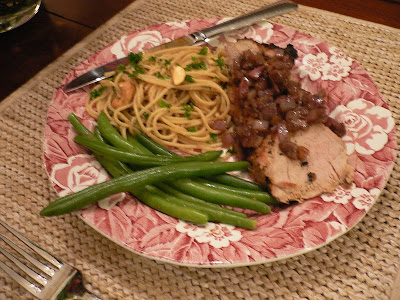 In a blender or small food processor blend marinade ingredients with salt and pepper to taste. In a large sealable plastic bag combine pork with marinade. Seal bag, pressing out excess air, and put in a shallow baking dish. Marinate pork, chilled, turning occasionally, at least 8 hours. Prepare grill or light gas grill. Let pork stand at room temperature about 30 minutes before grilling. Remove pork from marinade,letting excess drip off, and grill on an oiled rack turning every 5 minutes and basting occasionally for about 15 to 20 minutes. Transfer meat to a cutting board and let stand 5 minutes before slicing. Serve pork with red onion marmalade.