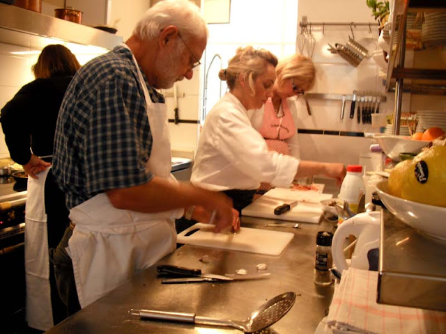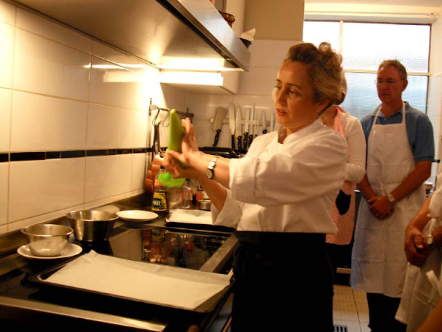 Seven of us joined her in her kitchen to cook a menu of White Asparagus with Mousseline Sauce, Roasted Chicken with Morel Mushrooms and Potatoes, and Profiteroles.