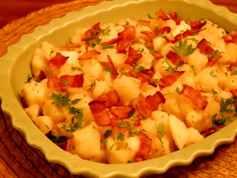 But this is supposed to be a post about hot German potato salad.  We had a pork roast the other night and I was tired of mashed potatoes so I made this classic standby.  I have experimented with German potato salad over the years and this is now my favorite way to make it.  It is a little bit sour from the vinegar which it is supposed to be, but tempered with a little sugar and enriched with chicken broth.  Of course the bacon is the best part.  Enjoy.