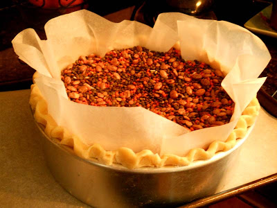 Next add a circle of parchment paper and fill with dried beans. I have a big bag of dried beans that I use over and over again to blind bake pie crusts. It is baked for a long time. I thought it would be too long but it worked out fine. You are now finished with this step, which can be done way ahead of time.