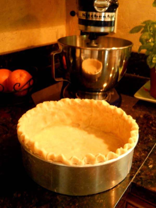 Place the unwrapped pastry on a floured board and roll in out to a 14″ to 16″ round, dusting with flour as needed. Carefully fit it into an oiled 9″ springform pan. Pat it into the pan and trim the excess pastry from the top, leaving enough pastry to flute the top. Flute and gently press the top against the edge. Chill the pastry shell for at least 20 minutes.