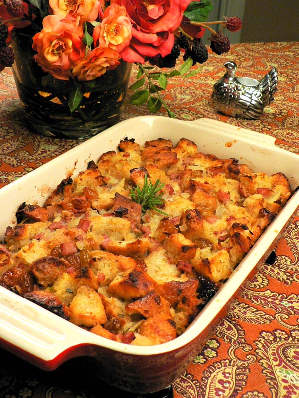 I now have three dressing casseroles in my repertoire for Thanksgiving. They are all my favorites because I love dressing so much that I would not be able to choose. Take your pick. This newest dressing is one that I saw in Bon Appetit last year. It is Rosemary Bread Stuffing with Prosciutto, Fennel and Lemon. One of my favorite breads is La Brea’s rosemary olive oil bread and this recipe is built around that kind of bread. How could you go wrong? Fennel is used liberally in the recipe and I love the subtle flavor that it imparts. Add prosciutto or speck to the mix and there is no doubt that it will be good. I made this last week and even David, who is not a stuffing or dressing aficionado, loved it.