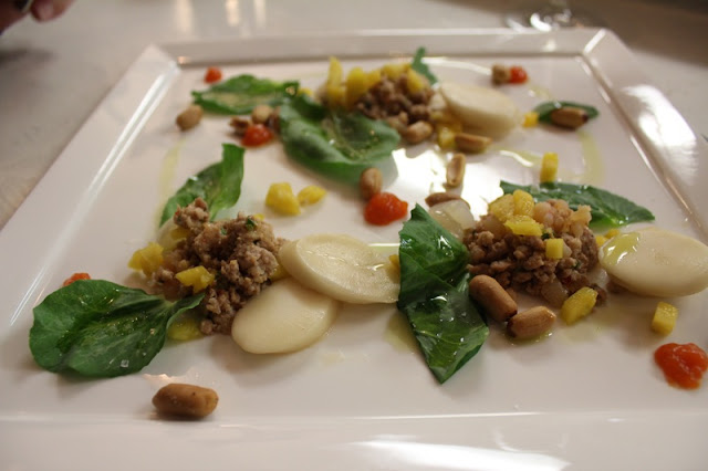 David received Spicy Pork and Shrimp Laarp Salad with Mango. It was garnished with rice dumplings,chili foam cilantro oil, toasted rice and roasted peanuts. What a bright combination of ingredients.