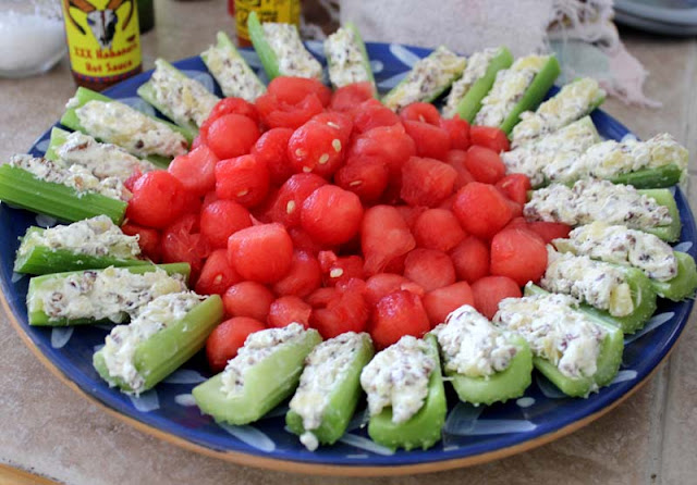 I brought watermelon and pineapple and cream cheese stuffed celery. The recipe is here. There were many appetizers and desserts that I did not get a picture of including a medley of delicious nuts from Cathy of Wives with Knives, who could not be there. Oregon would be a long way to come, but thank you Cathy. The nuts were delicious.