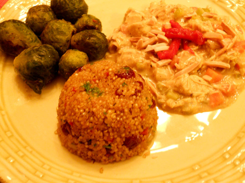 With the spiced quinoa timbales I served curried chicken from the leftovers of a roasted bird and roasted brussel sprouts. I love brussel sprouts browned in the oven. But even more I loved the flavors in the quinoa. This is an outstanding side dish that I will be cooking often.
