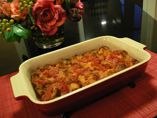 There is a new variety of potato in the supermarkets that I have not seen before. It is called Klondike Rose and it is a red skinned Idaho potato. The flesh is a golden color and it has a buttery taste. It sounded like the perfect vehicle for a potato gratin because the potatoes would hold their shape when arranged decoratively in the dish. Russet potatoes fall apart when cooked and are better suited for baking or mashing and because they have a high starch content make excellent french fries, potato pancakes, or galettes. The Klondike Rose is a waxy potato and is good roasted, boiled, or in au gratin dishes. When I peeled these potatoes they indeed were very golden and it was easy to slice them thinly. They held up well, but I have adjusted the recipe because I cooked them for 8 minutes on top of the stove and they did fall apart somewhat. I tucked the broken potatoes under the perfect rounds which I overlapped to make the dish look better. Cook for only 3 minutes on the stove top because they are in the oven long enough to finish cooking. This was a very satisfying dish – shades of Patricia Wells in Provence.