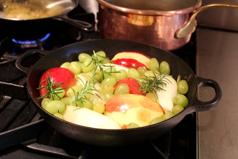 Put a large skillet over low heat and toss in the butter. When it’s melted, put the endive into the pan cut side down and the apples skin side up. Add the grapes, scatter over the rosemary, and cook, undisturbed, for 20 minutes, at which point the underside of the endives will have caramelized and the apples and grapes will be soft and perhaps browned. Gently turn everything over, baste with any liquid in the pan, and cook for 20 minutes more.