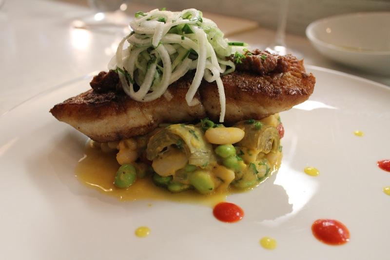 The third course was Bacon Crusted Quail with Foie Gras, Hazelnuts, Date Butter and Pickled Pears, paired with R&D Flanders Red Ale. Quoting Sean here about this beer, “the R&D Flanders Red Ale is a single batch of 10 gallons brewed on our home brew system. Kevin, one of our brewers, brewed the beer last year and it had been aging for about 18 months. It’s a sour ale with roeselare wild yeast and traditional beer ingredients; no curious Southern add ons. The wild yeast lends a wonderful acidity that refreshes the palette, standing up well to that decadent foie gras. A lighter beer would have gotten lost. A hoppy beer would have overwhelmed the palette. It was my favorite pairing of the evening.” I have to agree with him. Both the quail dish and the beer were brilliant.
